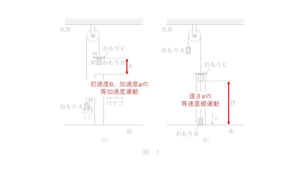 - B+Cがパイプの上端に到達した瞬間の速さ$v$がわかれば、問2の式から$a$を求めることができます。