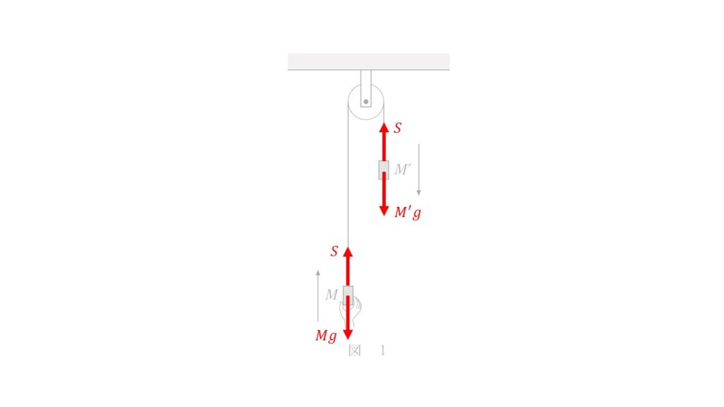 二つのおもりが糸でつながれていて、定滑車にかかっている問題です。